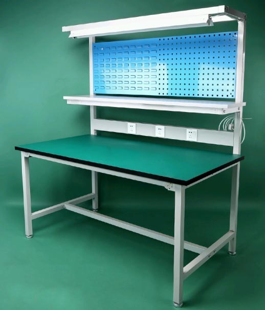 面板:采用優質防靜電膠皮全覆蓋桌面,戴育防靜電桌面通過了《國家電子行業標準SJ/T10694-2006規定》的點對點電阻防靜電測試。防靜電膠皮厚2mm。面板采用三聚氰胺聚合板,50mm的加厚桌面可定制;